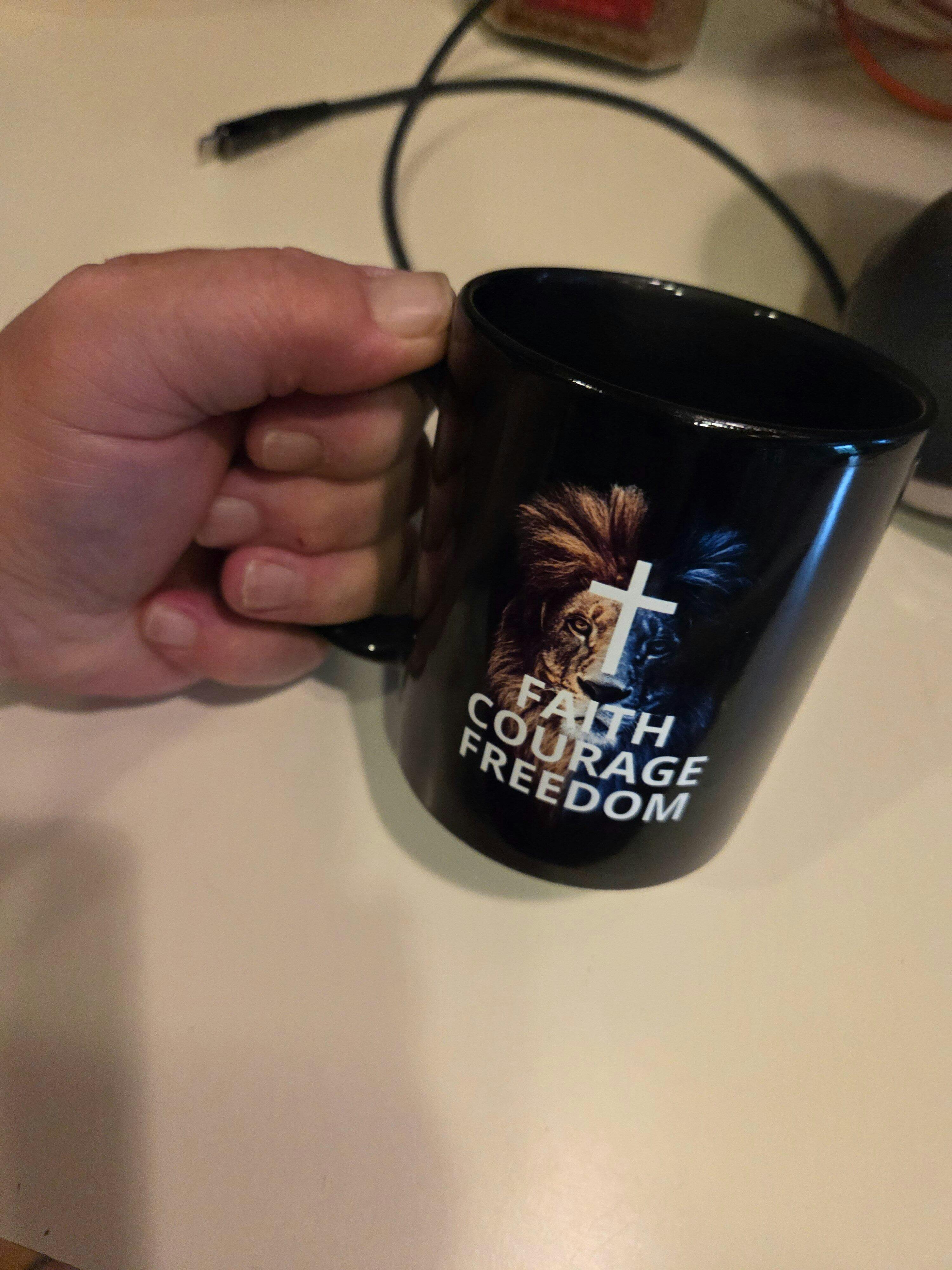 Exclusive Two Toned Lion & Cross - Faith Courage Freedom Black Glossy Mug